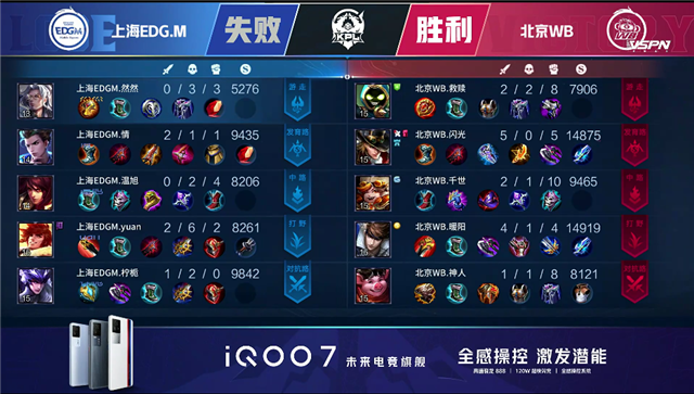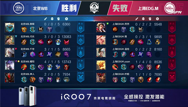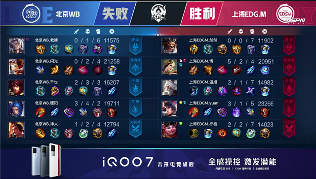 双方和平开局。2分22秒,北京WB拿下先知主宰,随后上海EDG.M拿下暴君。5分27秒,北京WB先后破掉上海EDG.M上、下一塔。6分04秒,上海EDG.M娜可露露击杀周瑜拿下一血,随后北京WB橘右京击杀猪八戒。7分14秒,上海EDG.M上路抓死橘右京,随后破掉北京WB上一塔。8分03秒,上海EDG.M下路击杀吕布。8分27秒,上海EDG.M破掉北京WB中一塔。10分20秒,上海EDG.M控下主宰。11分41秒,上海EDG.M控下黑暗暴君。12分22秒,上海EDG.M破掉北京WB中二塔。13分13秒,中路团,上海EDG.M打出1换2。14分36秒,上海EDG.M再次控下主宰。16分05秒,上海EDG.M控下黑暗暴君。18分50秒,上海EDG.M拿下主宰。20分21秒,上海EDG.M姜子牙大闪击杀鲁班七号,随后控下风暴龙王。21分03秒,上海EDG.M破掉北京WB下高地,随后北京WB反打打出0换4。24分44秒,上海EDG.M姜子牙配合娜可露露击杀橘右京。25分06秒,上海EDG.M拿下风暴龙王。25分40秒,上海EDG.M破掉北京WB上高地。28分钟,上海EDG.M虞姬击杀鲁班七号,随后破掉北京WB中高地。28分35秒,高地团,上海EDG.M团灭北京WB,随后破掉水晶先下一城。