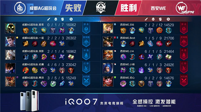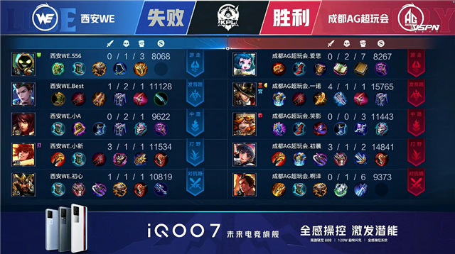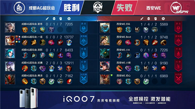双方平稳开局,2分14秒成都AG拿下暴君。3分30秒双方下路1换1,西安WE拿下一血。6分08秒西安WE下路击杀鲁班大师。6分51秒西安WE拿下暴君。7分55秒成都AG摧毁敌方上路外塔并击杀盾山。10分35秒成都AG摧毁敌方中路二塔。10分53秒成都AG摧毁敌方上路二塔。11分37秒成都AG拿下暗影暴君。12分17秒成都AG摧毁敌方中路高地塔。13分53秒下路团战双方1换1,成都AG摧毁敌方下路高地塔。14分33秒摧毁敌方水晶拿下比赛。