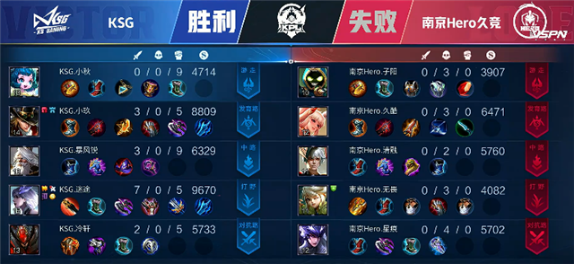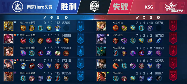 开局南京Hero久竞中路和上路换线。1分24秒南京Hero久竞入侵野区,娜可露露拿到一血。2分11秒娜可露露拿下暴君。4分04秒娜可露露拿下主宰。5分47秒南京Hero久竞强攻上路一塔,赵云被击杀。6分25秒KSG上路一塔被破。6分44秒南京Hero久竞拿下暴君。6分58秒上野区团战,双方打出1换1。8分37秒KSG推掉下路一塔。9分30秒KSG推掉上路一塔。10分17秒南京Hero久竞拿下暴君,双方爆发团战,KSG打出1换2。11分33秒中路团战,吕布被击杀。12分钟南京Hero久竞强攻中路一塔,双方打出1换1,南京Hero久竞推掉中一塔。13分下野区团战,不知火舞被击杀,KSG推掉中一塔。14分35秒下野区团战,赵云被击杀。15分33秒娜可露露拿下暴君,双方团战南京Hero久竞打出0换2。16分31秒,南京Hero久竞拿下主宰。16分44秒上路二塔处团战,南京Hero久竞推掉上路二塔,团战KSG打出0换5。20分15秒中路爆发团战,南京Hero久竞打出1换4,伽罗拿下四杀。21分09秒,南京Hero久竞攻破水晶拿下本场比赛胜利。