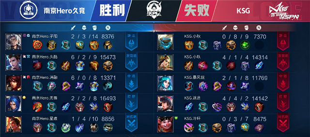 双方平稳开局。2分14秒镜拿下主宰。2分25秒阿古朵拿下暴君。4分18秒,中路下河道团战,KSG打出0换2,镜拿下一血。5分钟马可波罗推掉下路一塔。5分21秒,上野区阿古朵被击杀。6分17秒马超被镜单杀。7分10秒南京Hero久竞中路一塔被破,团战KSG打出0换5。7分57秒南京Hero久竞中路高地塔和上路高地塔被破。9分59秒下野区团战,KSG打出0换2。10分19秒,KSG攻破水晶扳回一局。