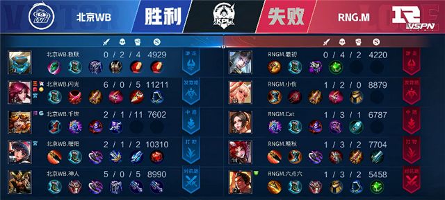 开局公孙离中路抢线,RNG.M入侵野区拿下红buff。1分钟,关羽拿下一血。2分17秒,百里玄策拿下暴君。3分钟中路上野区团战,北京WB打出0换3,关羽拿下双杀。4分钟RNG.M强攻下路一塔,盾山被击杀。5分24秒RNG.M下路一塔被推掉。6分30秒娜可露露拿下暴君。7分40秒中路爆发团战,北京WB打出2换5。9分18秒,RNG.M上路二塔被推掉。10分10秒上野区东皇太一被击杀。10分35秒RNG.M中路二塔被破。11分13秒娜可露露拿下暴君。11分56秒下野区团战,北京WB打出1换4。12分20秒,北京WB攻破水晶拿下本场比赛胜利。