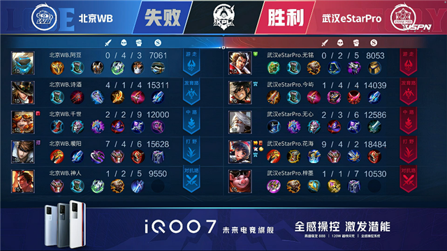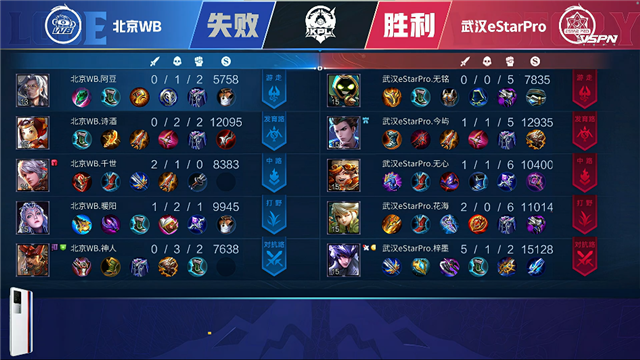 开局武汉eStar入侵北京WB蓝野区,赵云抢下蓝Buff,1分18秒武汉eStar拿下中路河道之灵。3分20秒武汉eStar拿下第一条暴君,4分50秒野区团武汉eStar娜可露露击杀赵云拿下一血,双方1换1。5分20秒团战北京WB打出1换4,5分47秒北京WB拆掉武汉eStar下路一塔。6分57秒武汉eStar拿下先知主宰,8分22秒赵云、娜可露露互换,10分53秒武汉eStar拿下暗影主宰。11分06秒暴君团武汉eStar击杀吕布,12分钟上路团北京WB击杀娜可露露,13分20秒武汉eStar拿下暗影暴君,北京WB打出1换2。14分30秒武汉eStar击杀盾山,15分25秒武汉eStar拿下暗影主宰。16分16秒北京WB三路二塔被破,武汉eStar击杀盾山,16分56秒武汉eStar拆掉北京WB上路高地,北京WB击杀蒙犽。17分43秒野区团北京WB打出0换2,18分09秒武汉eStar娜可露露击杀沈梦溪。20分30秒下路团战娜可露露四杀,武汉eStar团灭北京WB,一波拆掉水晶拿下胜利。