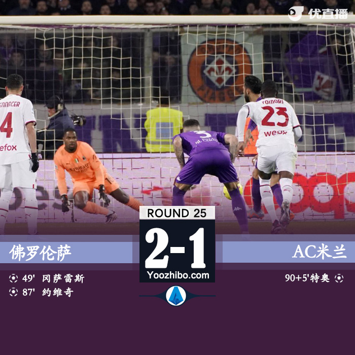 24直播网讯 北京时间3月5日凌晨3:45,意甲第25轮,佛罗伦萨对阵AC米兰。上半场,托莫里门线解围,迈尼昂多次扑救力保球门不失;下半场,托莫里送点,冈萨雷斯点射首开纪录,约维奇头球破门扩大比分,补时阶段特奥爆射扳回一球。全场比赛结束,AC米兰1-2佛罗伦萨,四连胜被终结!