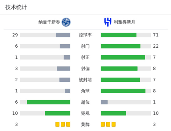 全场比赛结束,利雅得新月2-0纳曼干新春。