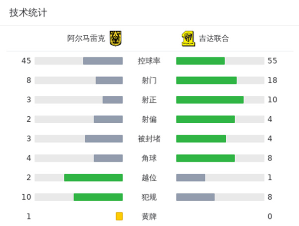 全场比赛结束,吉达联合2-1阿尔马雷克,提前出线。